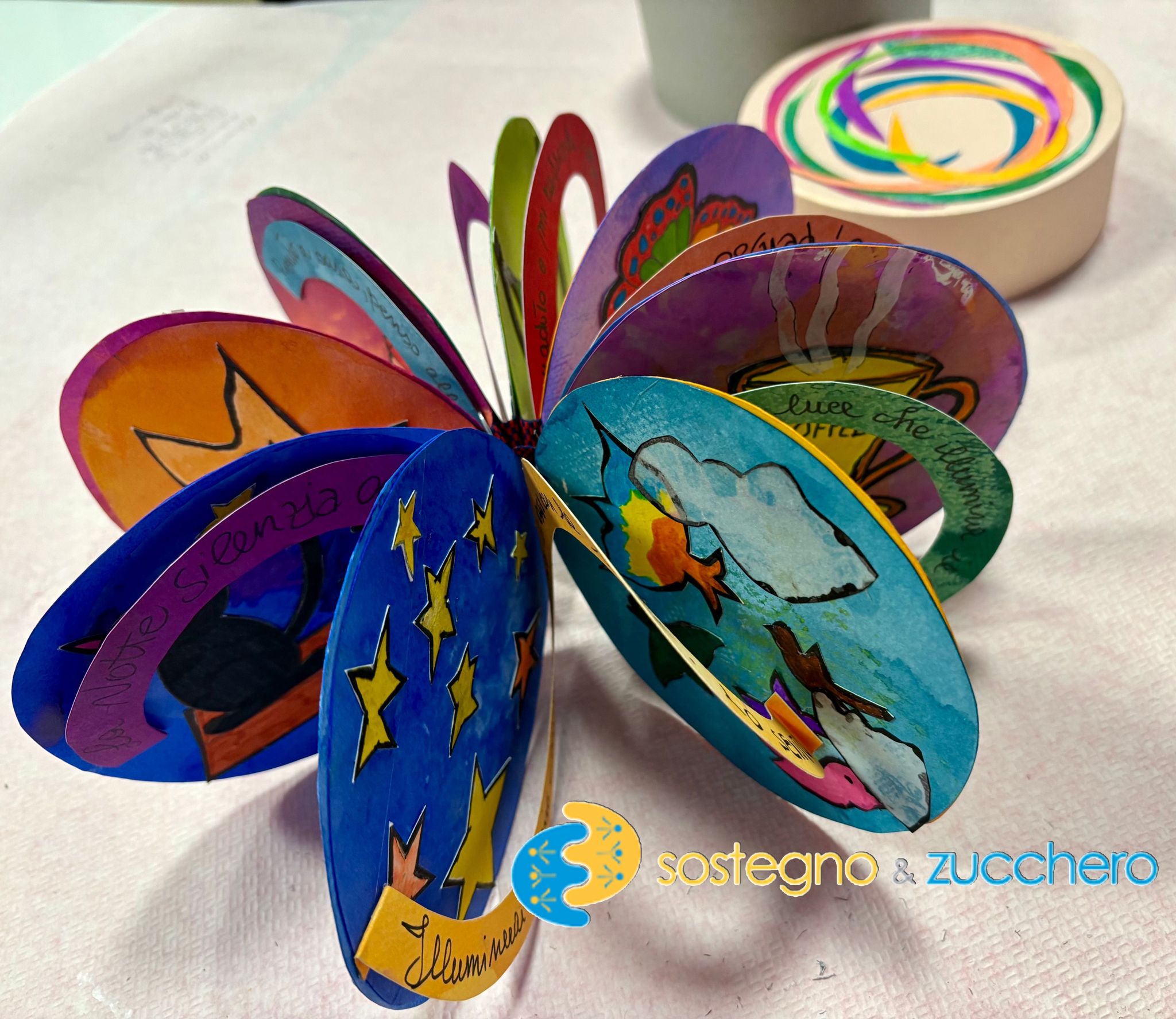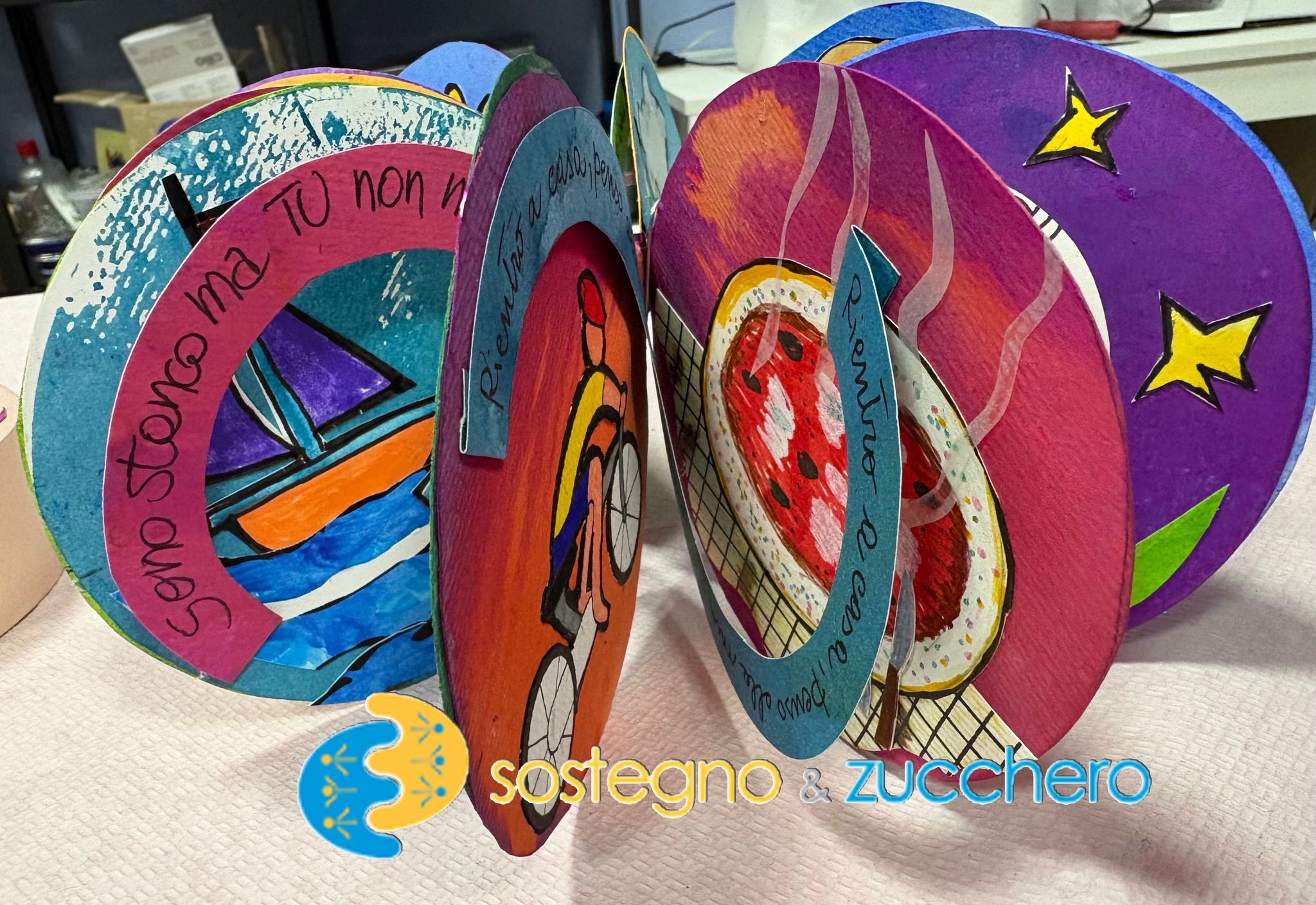 Il tema di questa edizione è la “circolarità”: i nostri ragazzi hanno realizzato un libro dove le ore della giornata e le azioni quotidiane si rincorrono dentro a cerchi coloratissimi, il tutto collegato da spirali che contengono piccole poesie sull’alba, mezzogiorno, tramonto e notte. Queste poesie sono state scritte da loro durante il corso di scrittura.